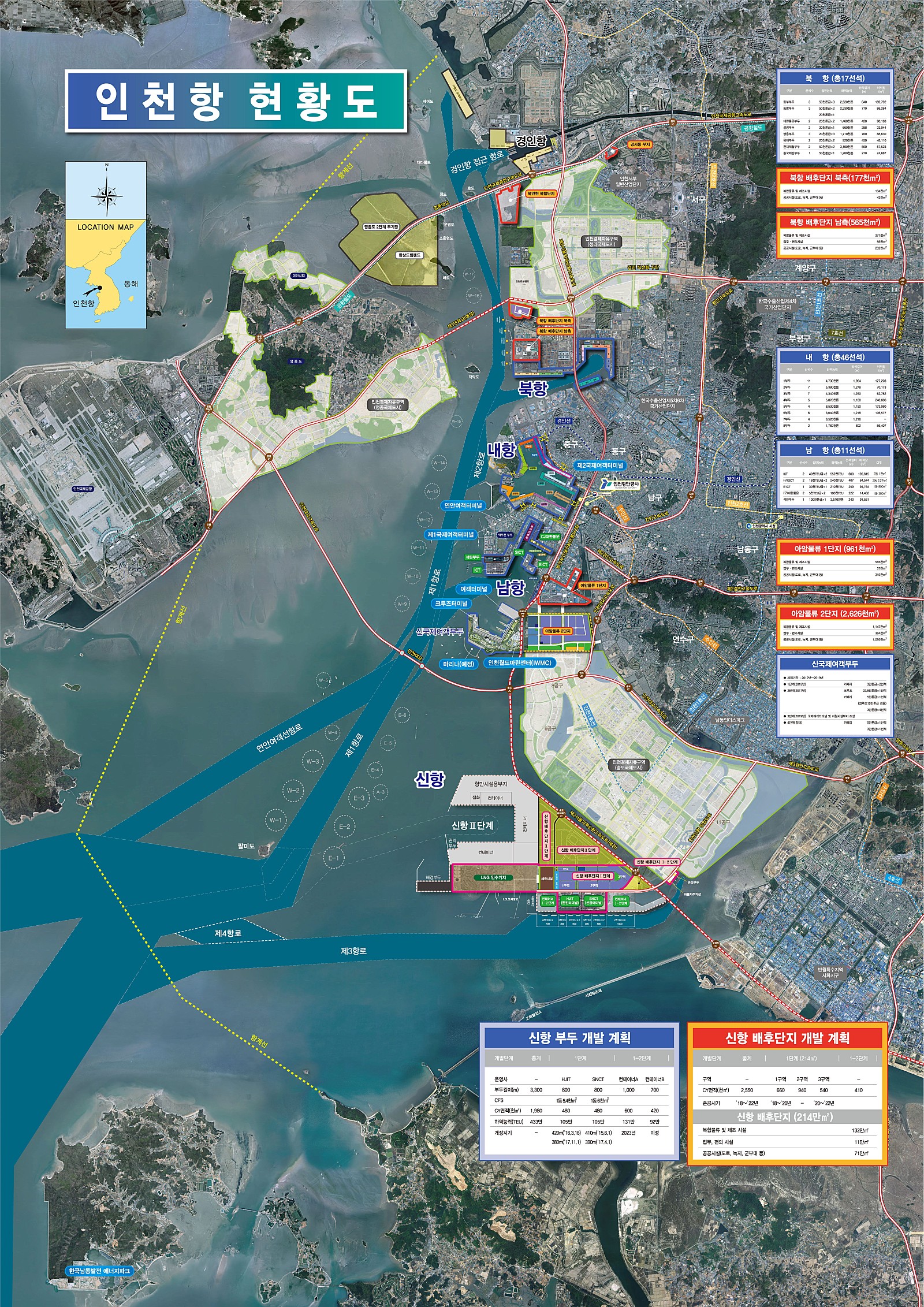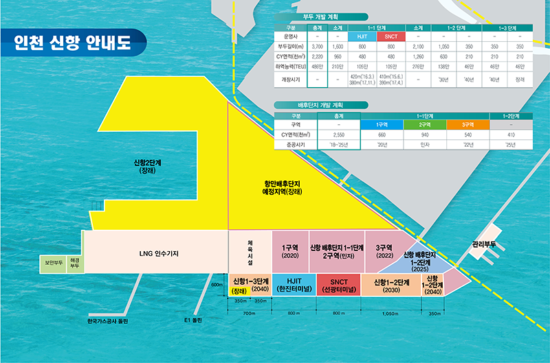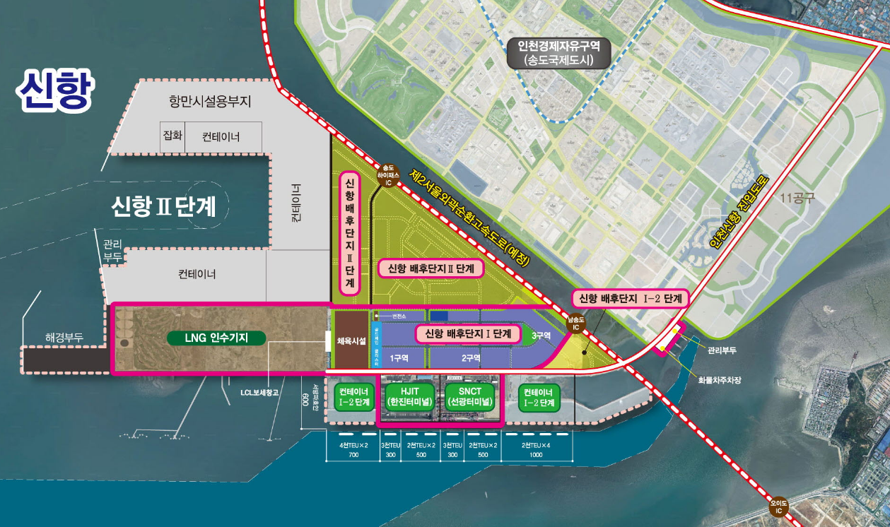 1.사업목적인천신항을 북중국 항만 및 환황해권에 대응하는 컨테이너 부두로 개발하여 급속히 증가하는 인천항 컨테이너 물동량의 원활한 처리와국제물류 거점항만으로 도약하고자 함2.사업개요사업기간 : 2007년 ∼ 2040년--------------------------------------------------------